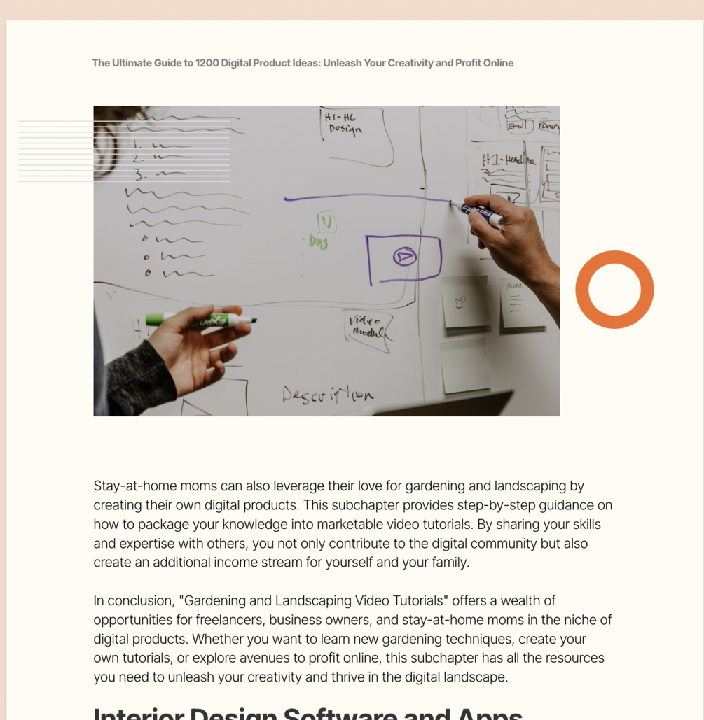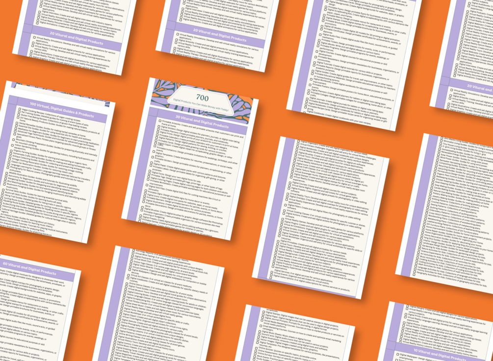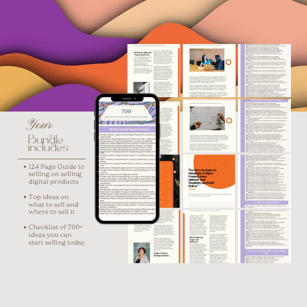 - Comprehensive Guide: A 124-page guide filled with hundreds of digital product ideas, tips, and resources. This guide will not only provide you with ideas but will also help you understand how to create, market, and sell your digital products.