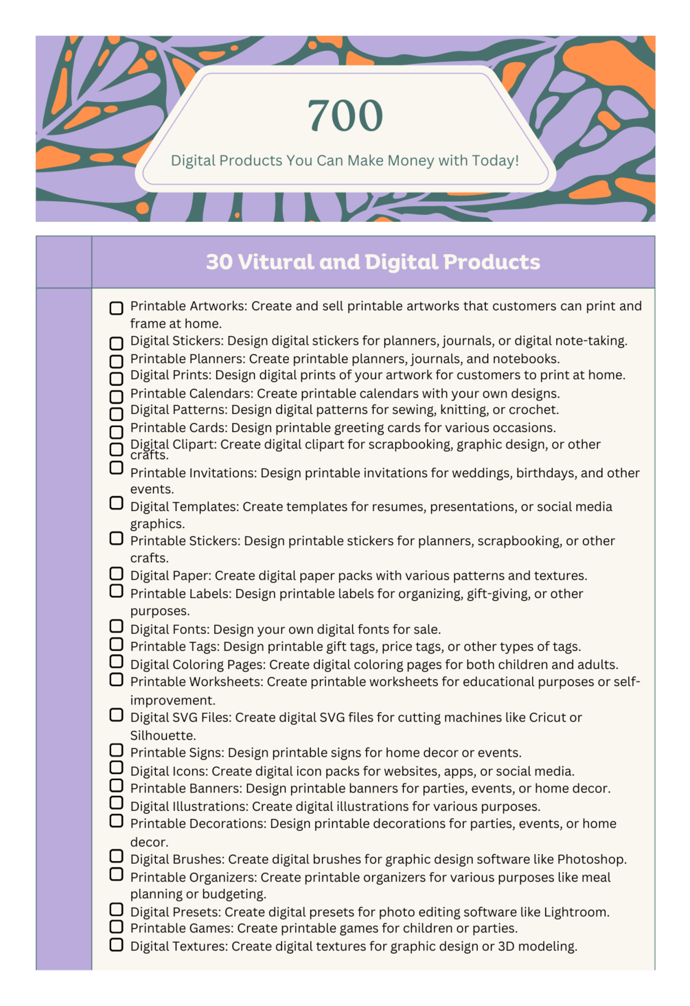 - Easy-to-Follow Checklist: A comprehensive checklist with over 700 digital product ideas organized by category. This checklist will help you quickly identify the ideas that resonate most with you and your audience.